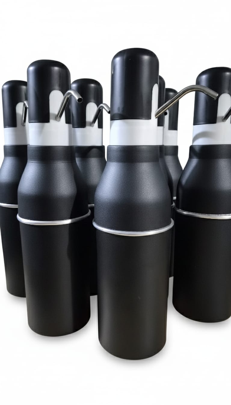Chopera de telgopor revestido en acero inoxidable en color negro mate, blanco o rosa. Capacidad de 1L, se introduce el envase de tu bebida, y tan solo presionando el botoncito te sirve automáticamente. Para detener el servido se vuelve a presionar el boton. Durabilidad de conservar el contenido frío ❄️ por más tiempo. Con cable usb para su uso independiente. Hasta agotar stock. Con grabado láser a elección.
